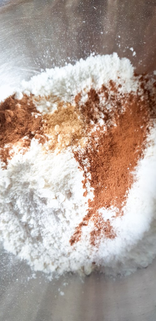 Dans un grand bol, mรฉlange les 285 g de farine, la cannelle, le gingembre moulu, le mรฉlange 4 รฉpices, la cardamome, les clous de girofle moulus, la levure chimique, le bicarbonate de soude et le sel. Ces รฉpices apporteront cette chaleur rรฉconfortante et ce parfum enivrant ร ton cake. Le simple fait de mรฉlanger ces รฉpices te plongera dรฉjร dans l’ambiance automnale !