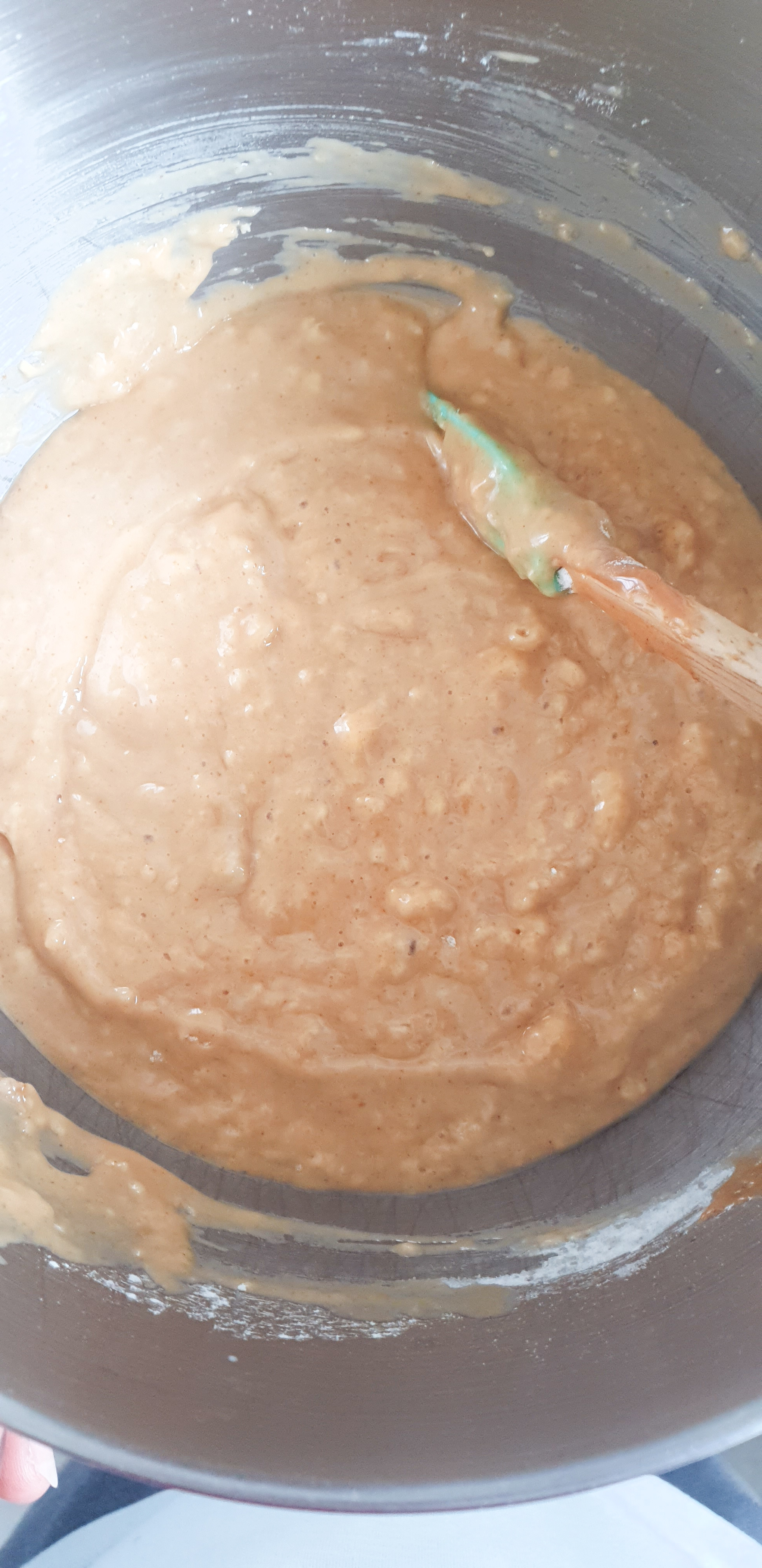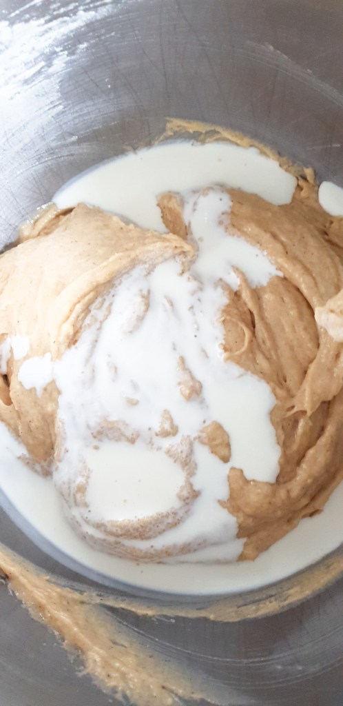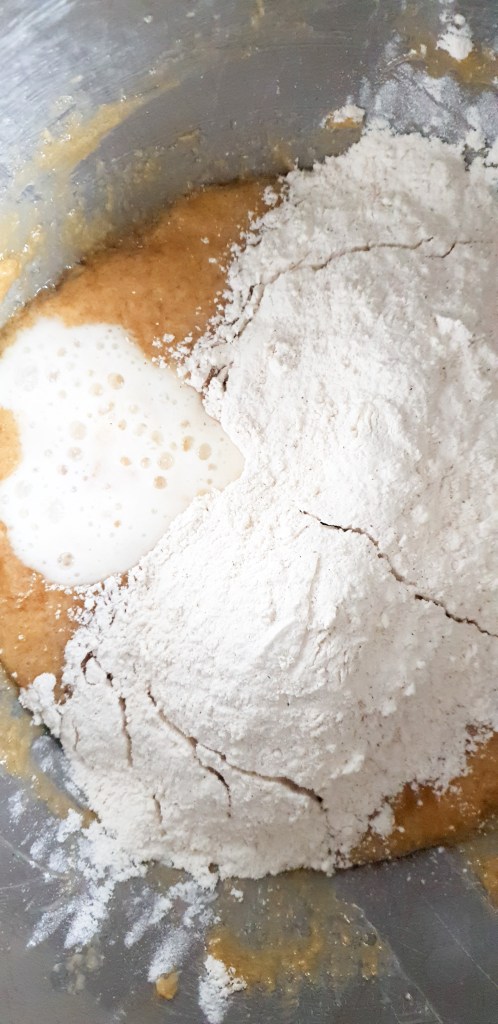 Maintenant que tes deux prรฉparations sont prรชtes, il est temps de les assembler. Alterne lโajout de ton babeurre maison et de ton mรฉlange de farine รฉpicรฉe dans le bol de la prรฉparation beurre-ลuf. Ajoute une portion de farine, mรฉlange doucement, puis une portion de babeurre, et ainsi de suite jusquโร ce que tout soit bien incorporรฉ. Cette mรฉthode garantit que ton cake reste lรฉger et bien aรฉrรฉ.