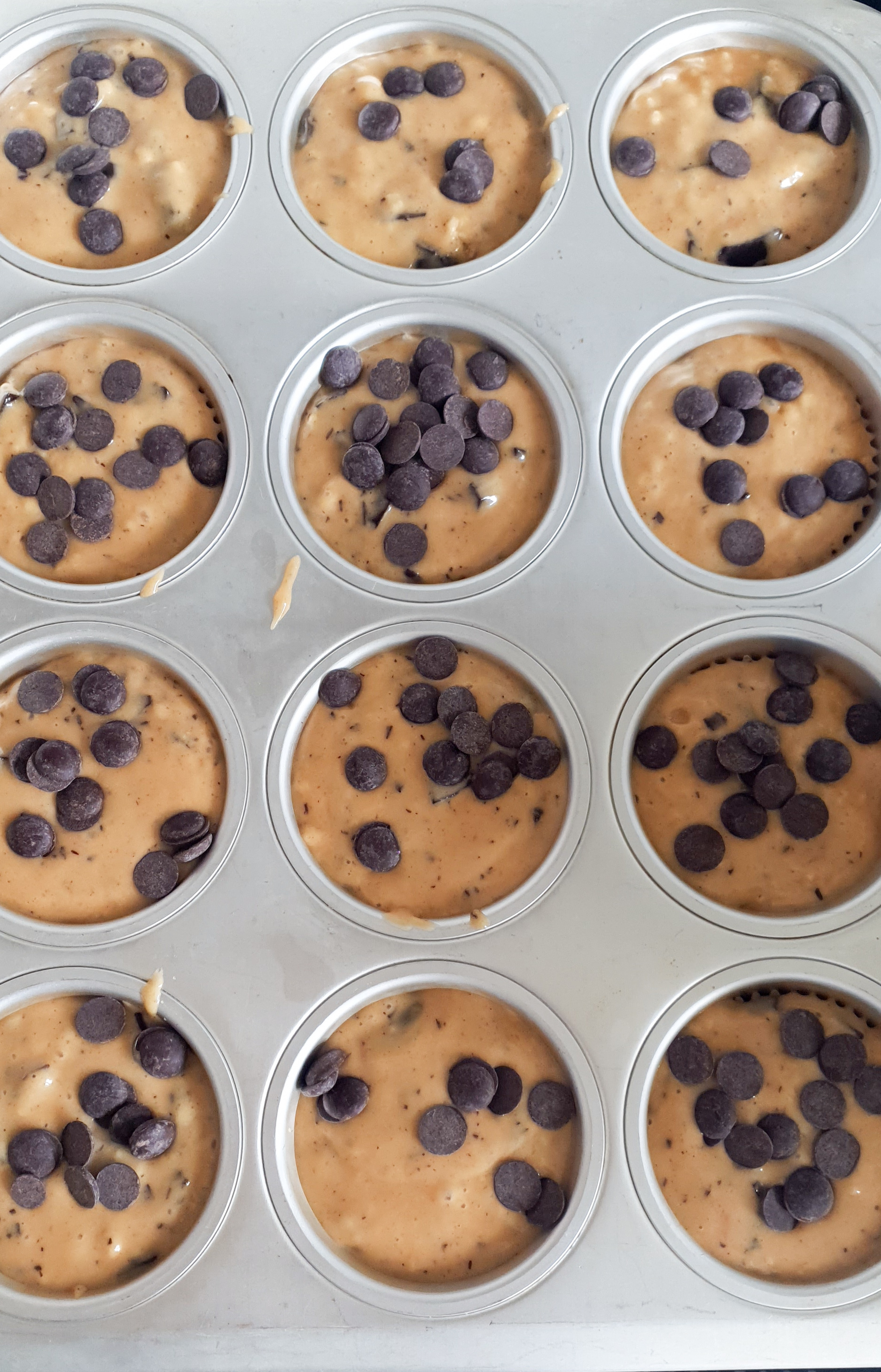 - Verser la pรขte dans les moules ร muffins, en remplissant chaque cavitรฉ aux trois quarts pour laisser de la place aux muffins de gonfler.