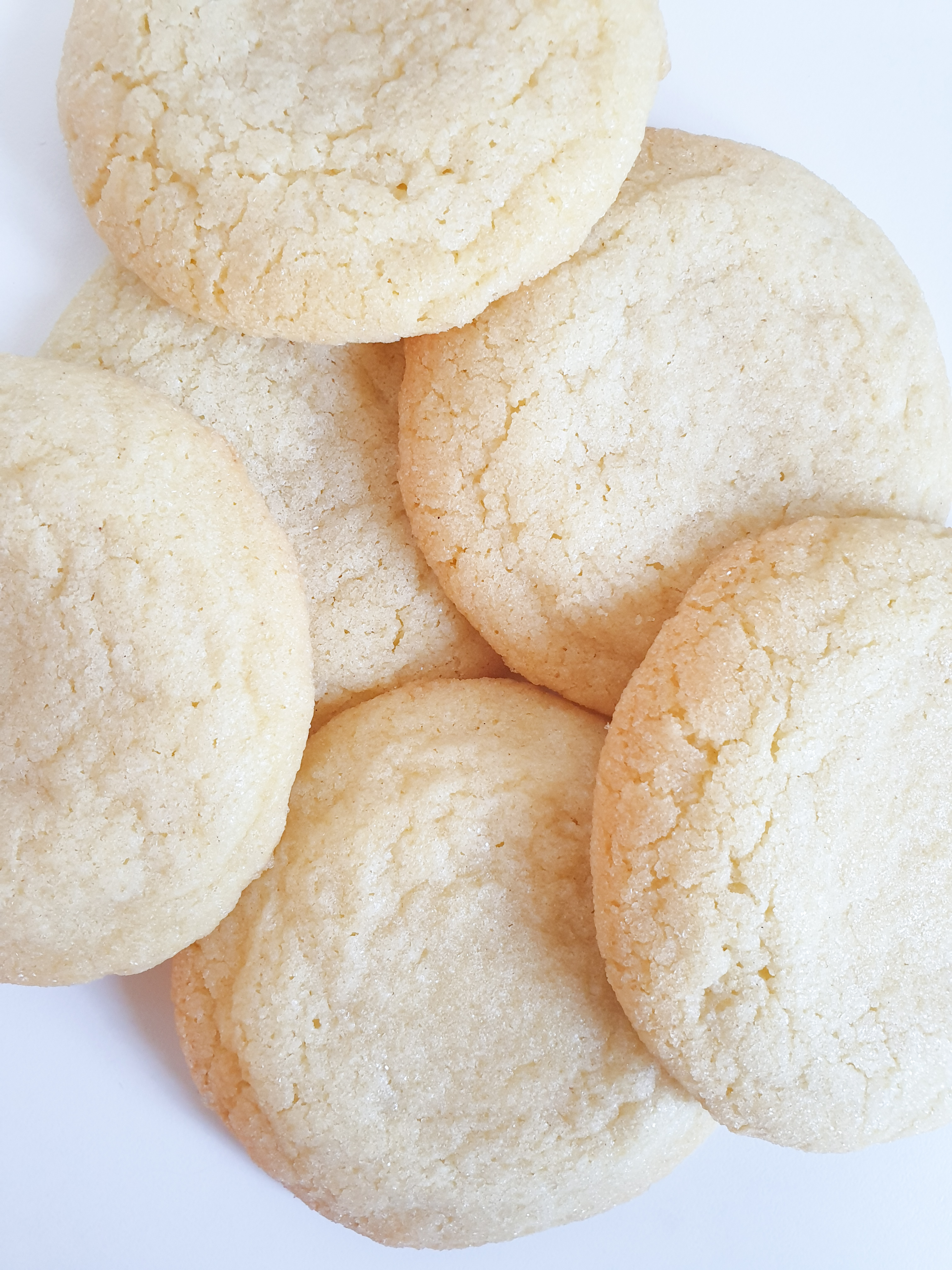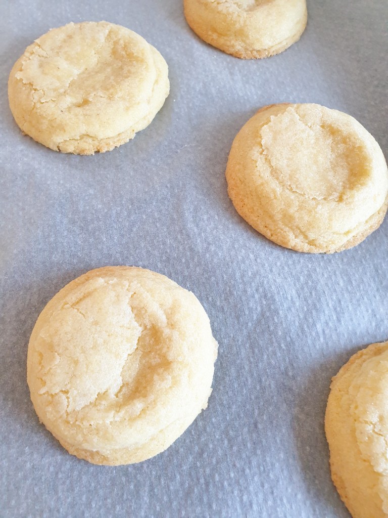 320g de farine – 2càc de levure chimique – 1càc de sel – 225g de beurre à température ambiante – EXCEPTIONNELEMENT pour cette recette 230g sucre blanc + 30g pour rouler les cookies (je n’utilise généralement pas de sucre raffiné, mais je voulais un rendu tout blanc, libre a toi d’y mettre le sucre que tu veux mais le rendu ne sera peut être pas le même!) – 1 œuf +1 jaune d’œuf – 1 càc d’extrait de vanille